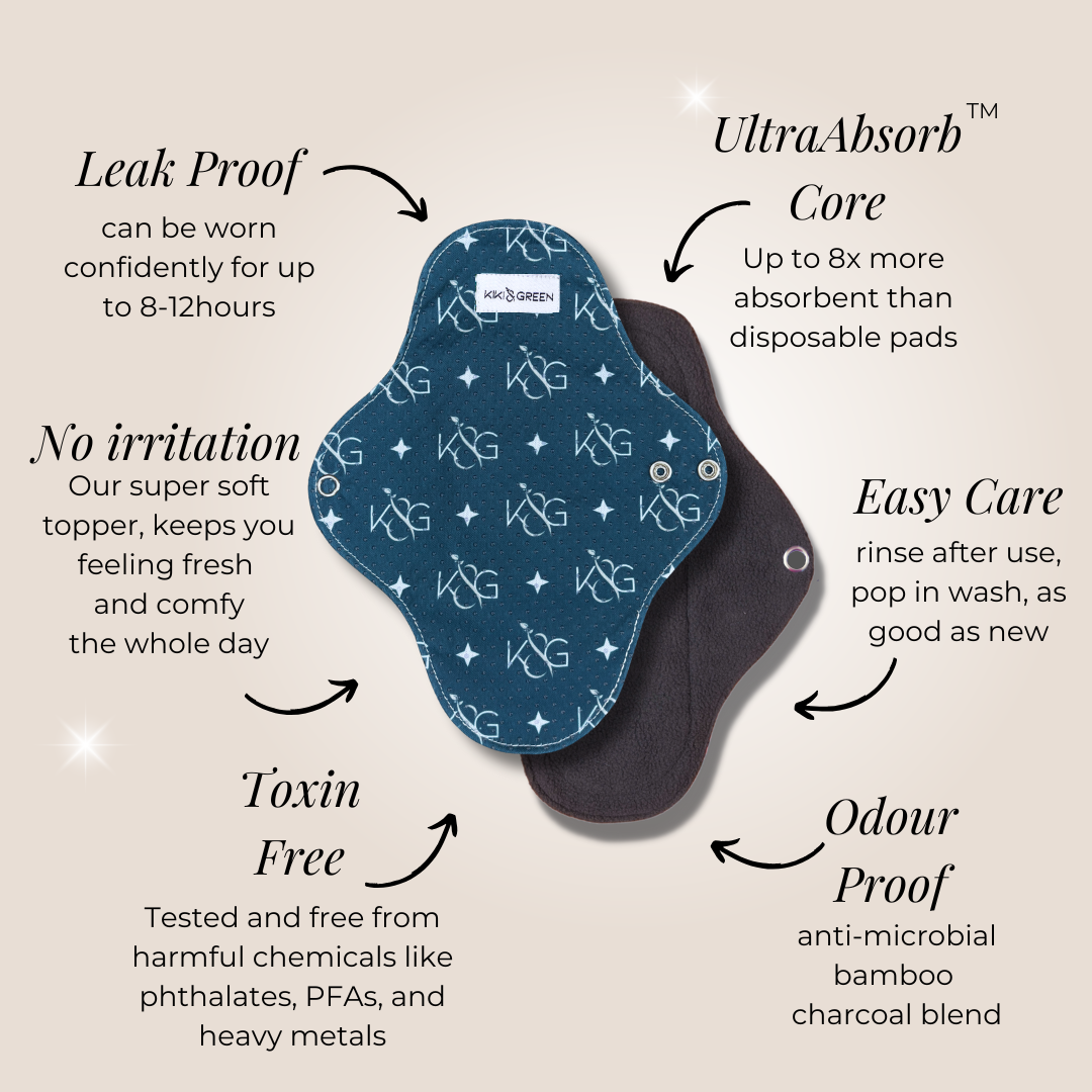 Discover KIKI & GREEN's premium, meticulously crafted period pads. Experience unmatched comfort and confidence as you wear our pads, designed to make you forget they're even there. With our exclusive UltraAbsorb Core™ Technology, enjoy leak-proof protection and stay effortlessly dry all day long.