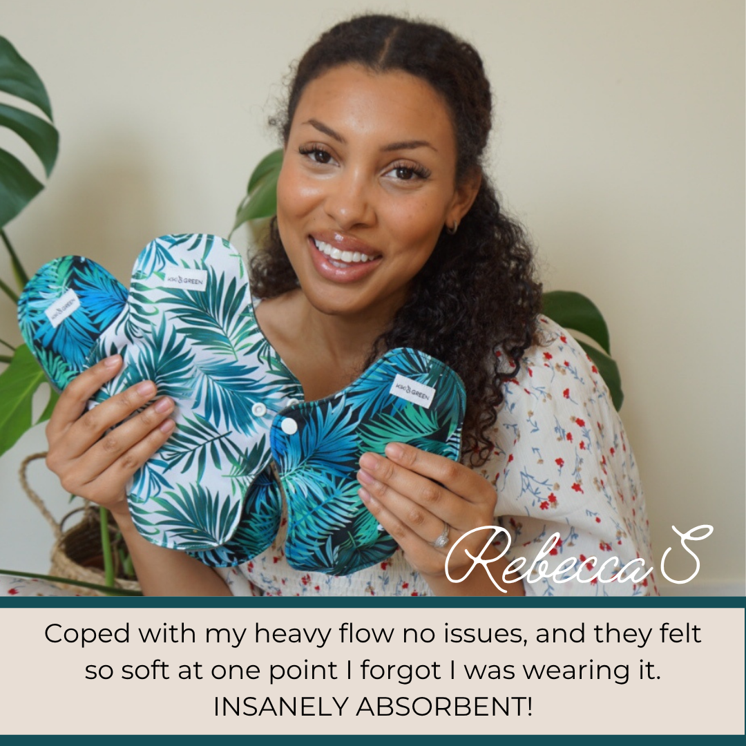 Not your usual period pads. KIKI & GREEN pads are 8x more absorbent than disposables, thanks to our UltraAbsorb™ Core that locks everything in - no leaks, no more panic.